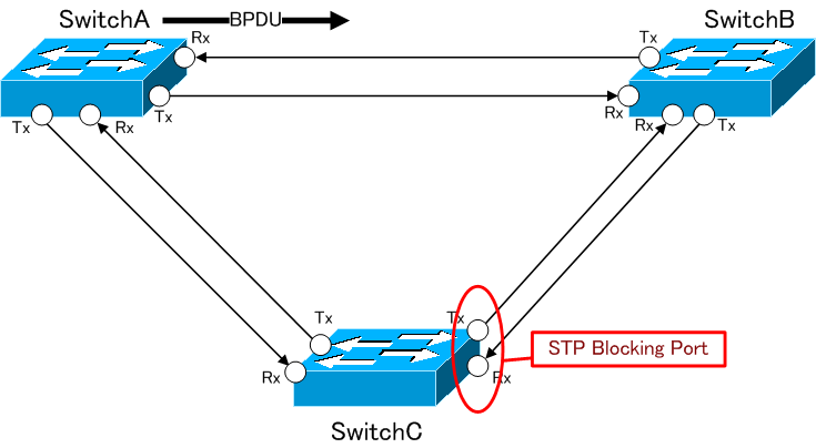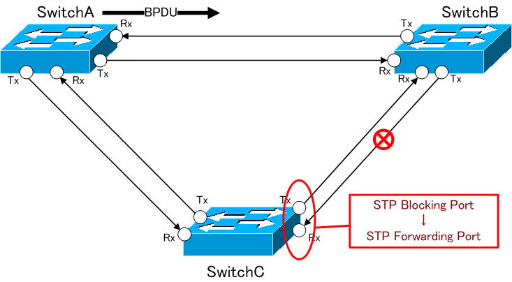 結果、SwitchA、SwitchB、SwitchC間でBPDUのLoop障害が発生します。