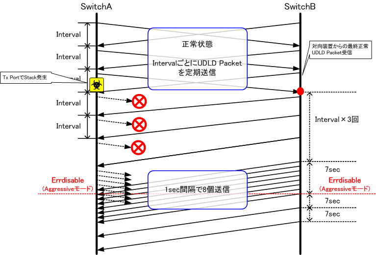 1.SwitchBではSwitchAのUDLD Packetが受信出来ないためSwitchAからの最終正常UDLD Packet受信後、Interval×3回時間経過後再開処理に走ります。