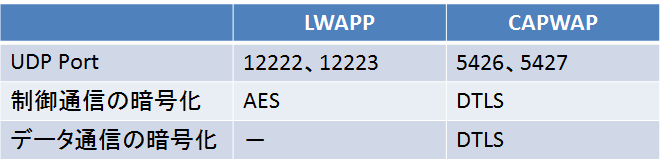 LWAPPとCAPWAPの相違点の代表的なものは以下のものがあります。
