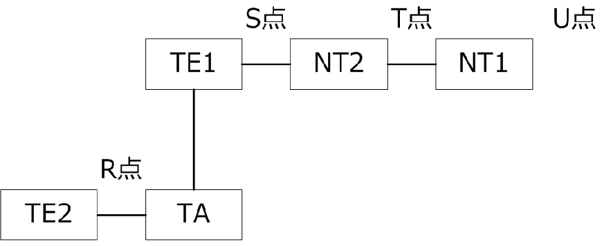 TE2-TA間をR点、TE1(またはTA)-NT2をS点、NT2-NT1間をT点、NT1-ISDN網をU点と呼びます。ただし、NT2は省略可能であるためNT2を省略した場合、S点とT点は同一インターフェイスとなります。この場合、S点とT点をまとめてS/T点と呼びます。