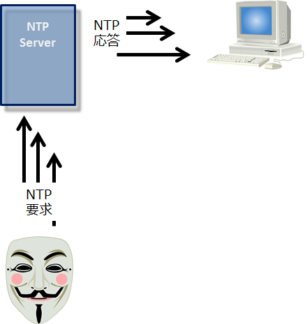 NTP Serverでは攻撃者から送信されたNTP要求パケットがIPアドレスを詐称されたものであると判断できないため攻撃対象端末へ大量のNTP応答パケットを送信します。
